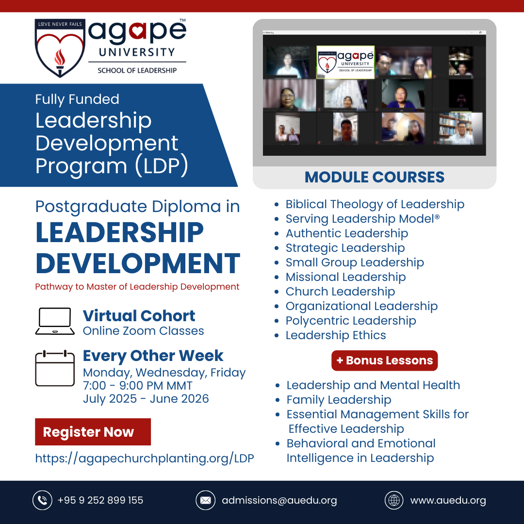 Agape University School of Leadership offers a non-accredited leadership development postgraduate diploma program, especially tailored for church planters, pastors, ministry leaders, and mission leaders to accelerate their personal growth and leadership development and learn to lead more like Jesus to transform themselves, their teams, organizations, and communities.